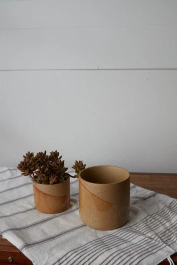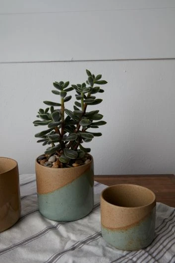 Atrractive modern planter from Accent Decor. Glaze dipped on a diagonal with raw speckled clay on the upper portion of the pot.