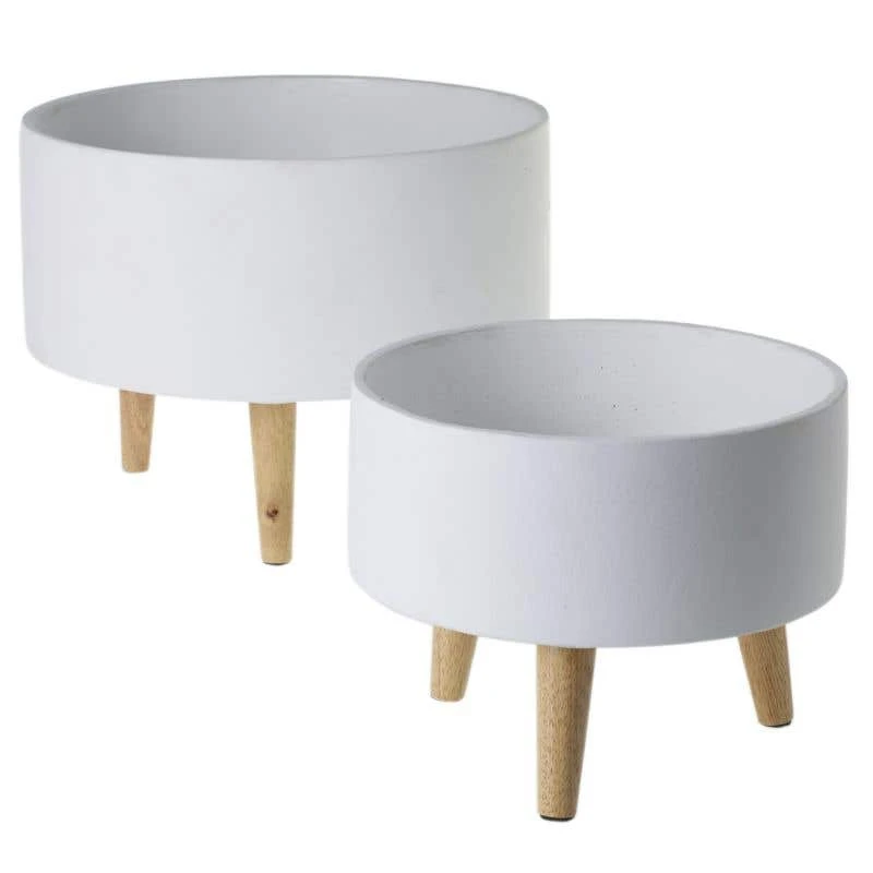 Attractive minimalist low planter or plant stand with wooden tripod legs.