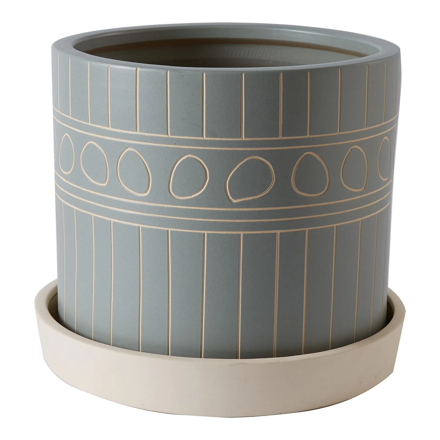 The Yona Pot is a large container with a hand carved pattern encircling the body. The saucer is footed and has a wide lip to comfortably hold the pot.
